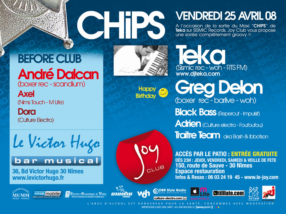 | | A l'occasion de la sortie du maxi " CHIPS" de TEKA sur SISMIC RECORDS , le Victor Hugo et le JOY Club vous invitent à une soirée totalement groovy funky touch !! Before au Victor Hugo avec : Dalcan , Dora et Axel Finish au JOY avec la Traitre Team, Greg Delon , Adrien , Black Bass et Teka Cela sera également l'anniversaire de Mr Greg Delon ACCES PAR LE PATIO : ENTREE GRATUITE !!!!!!!!!!!!!!!!!!!!!!!!!! http://nsm01.casim...925274.jpg http://nsm01.casim...925279.jpg | |