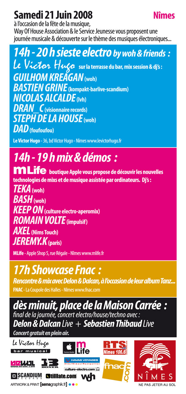 | | A l’occasion de la fête de la musique, l’association Way of House & le service jeunesse, vous proposent une journée musicale & découverte sur le thème des musiques éléctroniques: >> 14h – 20h à la terrasse du Victor Hugo :mix sessions & Djs : - Guilhom Kreagan (woh) - Bastien Grine (woh, barlive, kompakt,scandium) - Nicolas Alcade (Victor Hugo) - Dran_C (visionnaire records) - Steph de la House (woh) - Dad (foufoufou) www.levictorhugo.fr >> 14h – 19h mix & démos à mLife, boutique Apple pour y découvrir les nouvelles technologies de mixs et de musique assisté par ordinateur avec : - Teka (woh, sismic) - Bash (woh, TTCrew) - Keep On (culture-electro, aperomix) - Romain Volte (Impulsif) - Axel (Nims touch) - Jeremy K (Paris) www.mlife.fr , 5 rue Régale, Nîmes >> 17h Showcase Fnac : Rencontre & mix avec Delon & Dalcan a l’occasion de leur album Tanz. Fnac, La Coupole, les Halles. >> 00h : Place de la Maison Carrée : concert gratuit avec Delon & Dalcan Live ainsi que Sebastien Thibault Live fly : http://nsm01.casim...120875.jpg http://nsm01.casim...120886.jpg | |